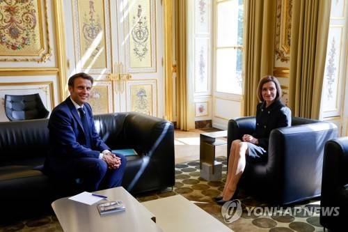 epa09957863 French President Emmanuel Macron (L) and Moldovan President Maia Sandu pose during their meeting at the Elysee Palace in Paris, France, 19 May 2022. The President of Moldova is on a one day working vist to France. EPA/LUDOVIC MARIN / POOL MAXPPP OUT