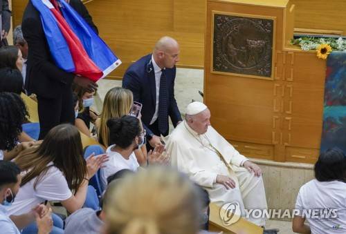 Students from different countries applauded to Pope Francis arriving for the launch of the 'Scholas Occurrentes' (Latin for schools of meeting) international educational movement at the pontifical Urbaniana University, in Rome, Thursday, May 19, 2022. (AP Photo/Andrew Medichini)