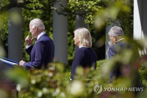 President Joe Biden accompanied by Swedish Prime Minister Magdalena Andersson and Finnish President Sauli Niinisto, walks out to speak in the Rose Garden of the White House in Washington, Thursday, May 19, 2022. (AP Photo/Andrew Harnik)