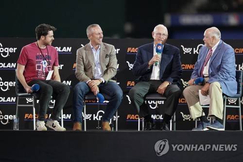 FILE - Baseball great and former Texas Rangers pitcher Nolan Ryan, second from right, speaks as Chuck Morgan, right, filmmaker Bradley Johnson, left, and his son Reid Ryan look on before a screening of a documentary film entitled "Facing Nolan" after a baseball ball game between the Atlanta Braves and the Rangers in Arlington, Texas, Sunday, May 1, 2022. (AP Photo/LM Otero, File) FILE PHOTO
