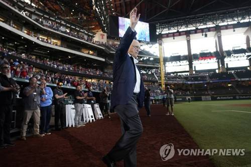 FILE - Baseball great and former Texas Rangers pitcher Nolan Ryan waves to the crowd as he takes the field for a screening of a documentary film about him, after a baseball ball game between the Atlanta Braves and Texas Rangers in Arlington, Texas, Sunday, May 1, 2022. (AP Photo/LM Otero, File) FILE PHOTO