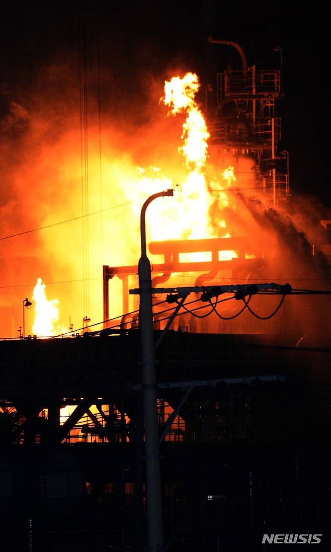 [울산=뉴시스] 배병수 기자 = 19일 오후 울산 울주군 에쓰오일 울산공장에 화재가 발생, 불길이 치솟고 있다 2022.05.19. bbs@newsis.com