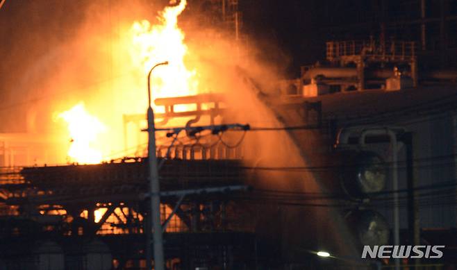 [울산=뉴시스] 배병수 기자 = 19일 오후 울산 울주군 에쓰오일 울산공장에 화재가 발생, 불길이 치솟고 있다 2022.05.19. bbs@newsis.com