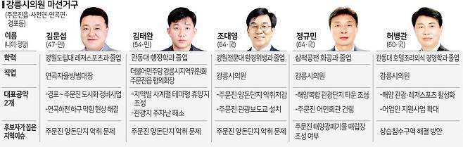 ‘강릉시의원 마선거구’는 선거구 개편으로 기존 주문진읍·사천면·연곡면 등 3개 지역에서 경포동이 새롭게 편입되면서 4개 지역이 한 선거구로 묶였다. 선출의원 정수 3명인 마선거구는 더불어민주당 후보 2명과 국민의힘 3명 등 모두 5명이 출사표를 던졌다. 현역의원 3명(조대영·정규민·허병관)과 함께 신예 2명(김문섭·김태완)이 격돌해 시의원 선거 최대의 격전지로 꼽히고 있다. 현역 3명은 모두 국민의힘이고, 이에 맞서는 신예후보 2명은 더불어민주당이다.