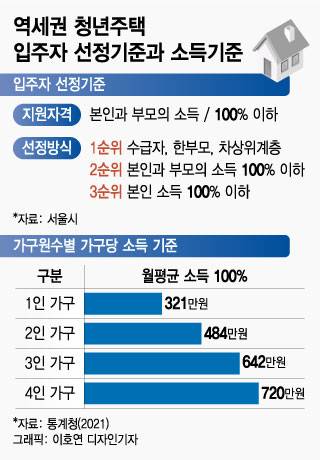 시는 입주자 선정에 반영되는 소득기준을 본인 소득 기준 도시근로자 가구원수 별 가구당 월평균 소득의 120%에서 본인과 부모를 합산한 기준 100% 이하로 변경한다. 바뀐 기준에 따르면 2022년 기준 1인 가구는 약 321만원의 소득, 4인가구는 약 720만원을 버는 수준일 때 자격이 주어진다.