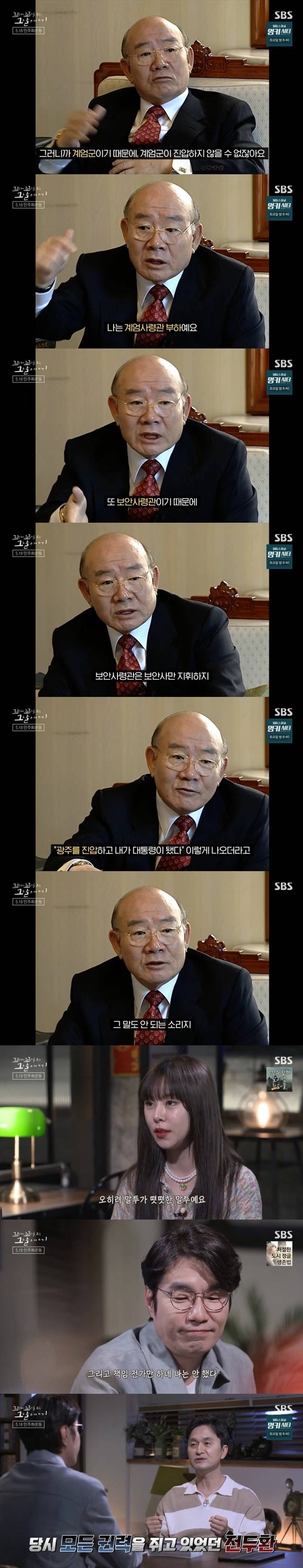 전두환은 “광주는 총기를 들고 일어난 하나의 폭동이다. 그러니까 계엄군이기 때문에 진압하지 않을 수 없다. 나는 계엄사령관 부하였고 보안사령관이었다. 보안사만 지휘하지 지휘권이 없다. 그걸 진압하고 내가 대통령이 됐다는데 되도 않는 소리다”고 말했다.