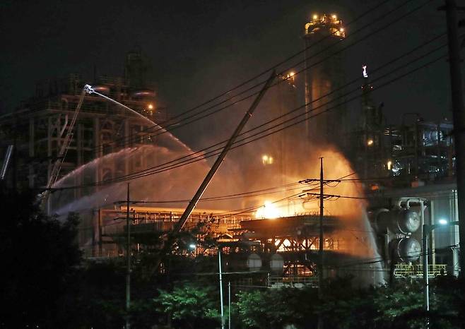 [19일 오후 울산시 울주군 온산공단 에쓰오일 울산공장에서 폭발로 대형 화재가 발생해 20일 오전까지 진화 작업이 이어지고 있다(울산=연합뉴스)]