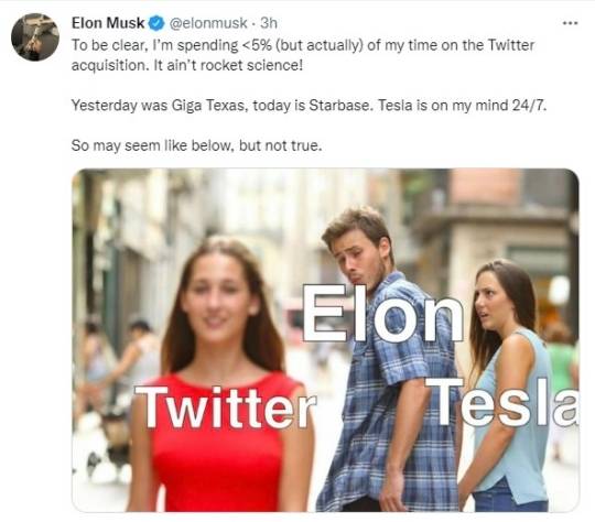 머스크는 20일(현지시간) 남자친구(일론 머스크)가 다른 여성(트위터)을 확인하는 것에 화가 난 여성(테슬라)의 모습을 담은 사진을 올리며 "이 같은 상황처럼 비춰질 수 있지만, 사실이 아니다"라고 트윗했다.