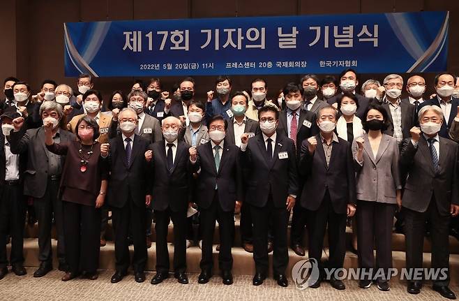 (서울=연합뉴스) 진연수 기자 = 20일 서울 중구 프레스센터에서 열린 제17회 기자의 날 기념식에서 김동훈 한국기자협회장과 박병석 국회의장 등 참석자들이 기념촬영을 하고 있다. 2022.5.20