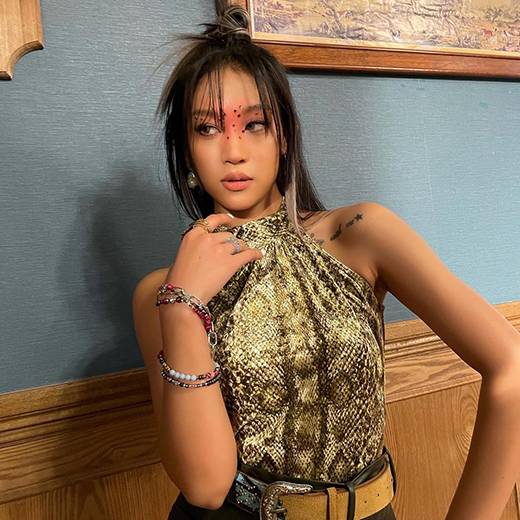 제시는 입체적인 컨투어링 메이크업으로 카리스마를 발산했다. 톤 다운된 베이스와 단계적인 쉐딩 터치로 얼굴 윤곽을 강조했으며, 퍼플 아이섀도로 그윽한 음영감을 부여하고 그레이쉬한 뮤트 톤 립을 오버하게 덧발랐다.