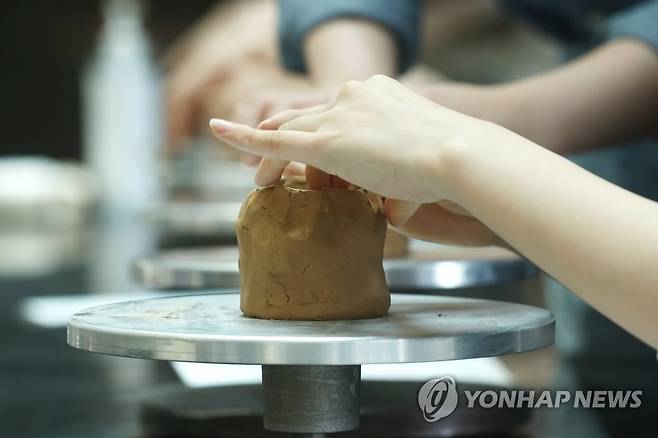 (서울=연합뉴스) 진연수 기자 = 20일 서울 중구 문화역서울 284에서 열린 '2022 공예주간(Craft week 2022)'을 찾은 학생들이 청자 컵 만들기 체험을 하고 있다. 이번 행사의 주제는 '우리 집으로 가자'로 전국의 공방과 화랑, 문화예술기관 등 648곳에서 참여하며 공예품 전시와 체험, 판매, 강연 등 총 1천397개의 연계 프로그램이 진행된다. 2022.5.20