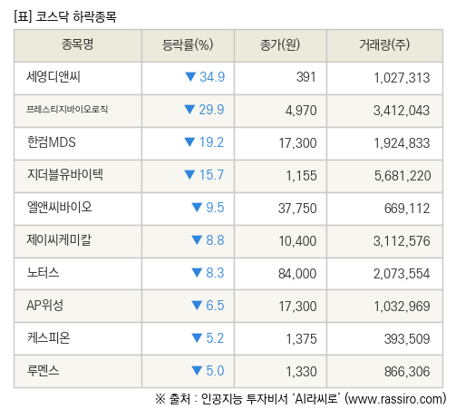 [fnRASSI]장마감, 코스닥 하락 종목(세영디앤씨 -34.9% ↓)