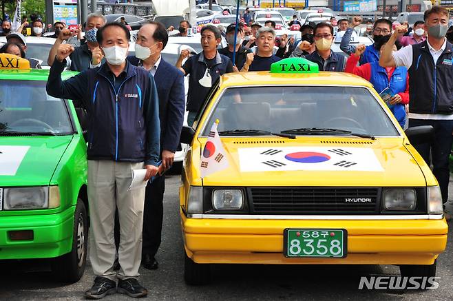 [광주=뉴시스] 이영주 기자 = 제42주년 5·18민중항쟁 민주기사의 날 기념식이 열린 20일 오후 광주 북구 무등경기장 앞에서 기념식에 참여한 택시기사들이 임을 위한 행진곡을 부르고 있다. 2022.05.20. leeyj2578@newsis.com