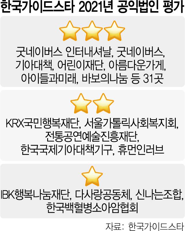 20일 공익법인 평가 기관인 한국가이드스타가 공익법인 719곳의 투명성과 효율성을 평가(2021년 공시 기준)한 결과 별점 3점 만점을 받은 곳은 전체의 4.3%인 31곳에 불과한 것으로 나타났다. 만점인 별점 3점을 받은 곳은 31곳, 2점을 받은 곳은 5곳, 1점을 받은 곳은 4곳이었다. 특히 2020년 평가에 이어 2년 연속으로 만점을 받은 곳은 22곳, 2016년도부터 2021년까지 6년 연속 만점을 받은 단체는 굿네이버스 인터내셔날, 굿네이버스, 기아대책, 어린이재단, 아름다운가게, 아이들과미래, 바보의나눔으로 7곳에 그쳤다.