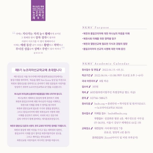 이어 “북한과의 접경지역 답사를 통해 한반도 분단 상황의 현재와 다가올 통일시대의 미래상을 그려보는 시간도 있다”며 “본 과정을 통해 북한 역사와 정치경제, 외교에 대한 지식뿐 아니라 국내외에서 이뤄지고 있는 북한선교 현황을 이해할 수 있게 될 것”이라고 덧붙였다.