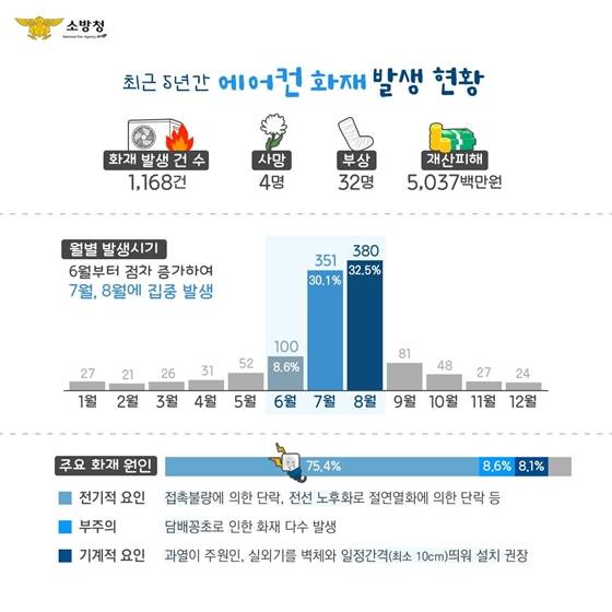 ◆ 에어컨 실외기 화재사례 ①전기적 요인 2022년 4월 28일 밤 8시 5분경 서울특별시 강북구 00동 단독주택 실외기 전원 선 불량으로 화재 발생 ②부주의(담배꽁초) 2021년 8월 8일 저녁 6시 40분경 경기도 수원시 팔달구 00동 건물 외벽과 실외기 사이 담배꽁초에서 발화 ◆ 최근 5년간 에어컨 화재 발생 현황 ①화재 발생 건 수 : 1,168건 ②사망 : 4명 ③부상 : 32명 ④재산 피해 : 5,037,000,000원 ⑤월별 발생 시기 : 6월부터 점차 증가하여 7월, 8월에 집중 발생 ⑥주요 화재 원인 -전기적 요인(75.4%) : 접촉 불량에 의한 단락, 전선 노후화로 절연열화에 의한 단락 등 -부주의(8.6%) : 담배꽁초로 인한 화재 다수 발생 -기계적 요인(8.1%) : 과열이 주원인, 실외기를 벽체와 일정 간격(최소 10cm) 띄워 설치 권장 ◆에어컨 실외기 화재, 이렇게 예방하세요! ①에어컨은 단일 전선을 사용하고 전선이 훼손되지 않았는지 확인하기 ②실외기 주변에 발화 위험물품 두지 않기 ③먼지를 충분히 제거하고 이상 유무 점검 후 가동하기 ④실외기 문제 발생 시 반드시 전문가에게 점검 의뢰하기 안전한 에어컨 사용법으로 올여름도 위.