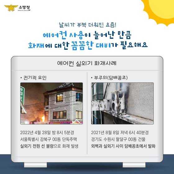 날씨가 부쩍 더워진 요즘! 에어컨 사용이 늘어난 만큼 화재에 대한 꼼꼼한 대비가 필요해요.