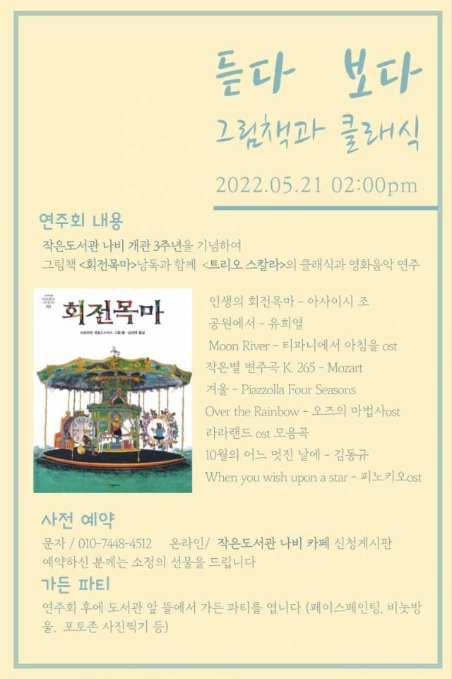 행사는 그림책 '회전목마' 낭독의 시간과 함께 '트리오 스칼라'의 클래식과 영화 음악 연주회로 진행된다.