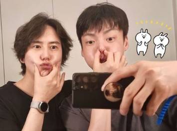 사진 속 안재현은 코를 두 손으로 막은 모습으로, 규현은 손가락으로 두 볼을 모은 모습으로 셀카를 찍고 있다. 코믹한 포즈로 인증샷을 찍는 두 사람의 찐친 바이브가 눈길을 사로잡는다.