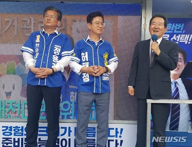 [대전=뉴시스] 조명휘 기자 = 정세균 전 국무총리가 20일 오후 대전 유성온천네거리 일원에서 허태정 더불어민주당 대전시장후보와 정용래 유성구청장후보 지원유세를 하고 있다. 2022.05.22. photo@newsis.com