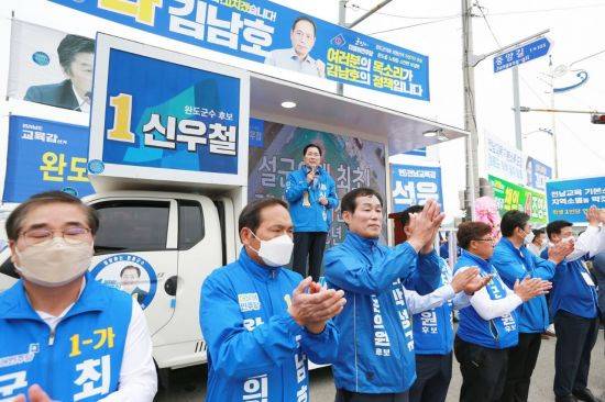 6.1지방선거 공식 선거운동 첫날인 지난 19일 신우철 전남 완도군수 후보를 비롯한 더불어민주당 완도군지역위원회는 완도읍 주도 앞 대로변에서 합동 출정식을 갖고 공식 선거운동에 돌입했다.