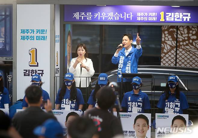 [제주=뉴시스] 우장호 기자 = 김한규 더불어민주당 제주시을 국회의원 후보가 20일 오후 제주시청 인근 거리에서 열린 공식 선거운동 출정식에서 지지자들과 인사하고 있다. 2022.05.20. woo1223@newsis.com