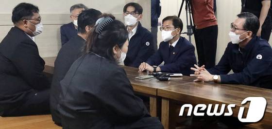 (울산=뉴스1) 조민주 기자 = 이정식 고용노동부 장관이 20일 오후 에쓰오일 온산공장 폭발 화재로 숨진 근로자의 빈소가 마련된 울산 남구의 한 장례식장에서 조문을 하고 있다. 2022.5.20/뉴스1