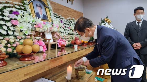(울산=뉴스1) 조민주 기자 = 이정식 고용노동부 장관이 20일 오후 에쓰오일 온산공장 폭발 화재로 숨진 근로자의 빈소가 마련된 울산 남구의 한 장례식장에서 조문을 하고 있다. 2022.5.20/뉴스1