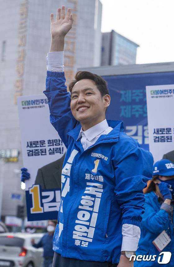 (제주=뉴스1) 오미란 기자 = 제주 제주시 을 국회의원 재보궐 선거에 출마한 김한규 더불어민주당 후보(47)가 20일 오후 제주시 이도1동 광양사거리에서 출정식을 열고 시민들에게 지지를 호소하고 있다.2022.5.20/뉴스1
