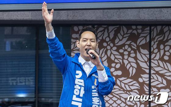 (제주=뉴스1) 오미란 기자 = 제주 제주시 을 국회의원 재보궐 선거에 출마한 김한규 더불어민주당 후보(47)가 20일 오후 제주시 이도1동 광양사거리에서 출정식을 열고 시민들에게 지지를 호소하고 있다.2022.5.20/뉴스1