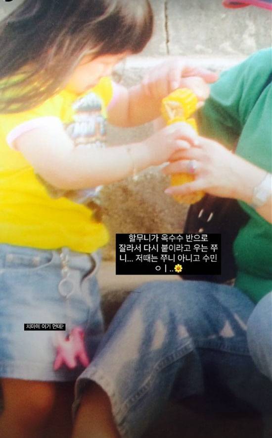 20일 최준희는 자신의 인스타그램 스토리에 "할머니가 옥수수 반으로 잘라서 다시 붙이라고 우는 쭈니... 저때는 쭈니 아니고 수민이"라고 이야기했다.