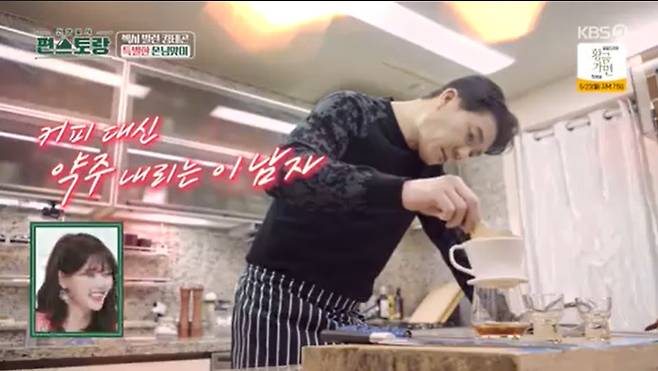 칼 손질을 끝낸 이태곤은 "중요한 손님이 오니까 특별한 선물을 줘야겠다"며 "아무나 안 주는 거다"라는 말과 함께 술병을 꺼내들었다. 이어 뚜껑을 불에 지지는 행동으로 시선을 사로 잡은 이태곤은 이어 술을 체에 거르는 모습을 보였다. 신기한 이태곤의 행동에 모두가 관심을 표했고 이태곤은 술의 정체를 밝혀 또 한 번 충격을 선사했다.