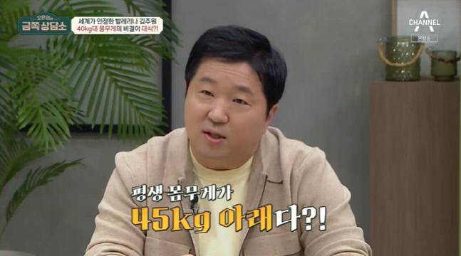 김주원은 “평생 45kg 아래였다?”는 질문에 “아니다”라고 단호하게 말하며 “저 지금 47.5kg 정도다”라고 정확하게 말했다.