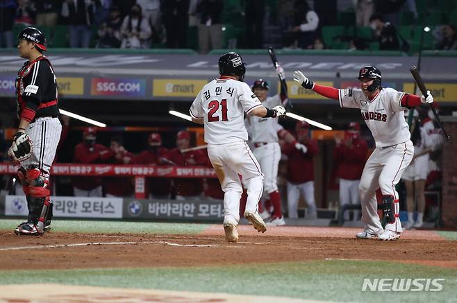 [인천=뉴시스] 고승민 기자 = 20일 인천 SSG랜더스필드에서 열린 2022 KBO 리그 LG 트윈스 대 SSG 랜더스 경기, 5대4로 LG를 꺾은 SSG 선수들이 기뻐하고 있다. 2022.05.20. kkssmm99@newsis.com