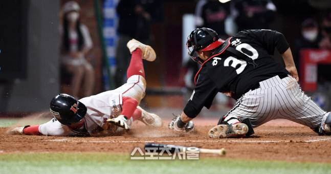 SSG 박성한(왼쪽)이 20일 인천 SSG랜더스필드에서 열린 2022 KBO리그 LG와의 경기 8회말 2사 2루 상황에서 오태곤의 적시타 때 2루에서 홈으로 파고 들어 동점 득점을 하고 있다. LG 포수는 허도환. 2022. 5. 20.
