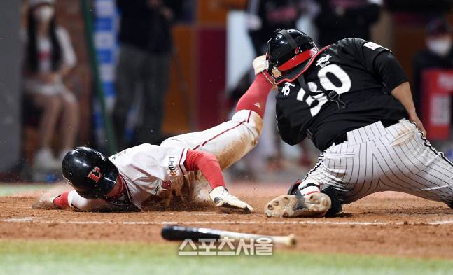 SSG 박성한이 20일 인천 SSG랜더스필드에서 열린 2022 KBO리그 LG와의 경기 8회말 2사 2루 상황에서 오태곤의 적시타 때 2루에서 홈으로 파고 들어 동점 득점을 하고 있다. LG 포수는 허도환. 2022. 5. 20.