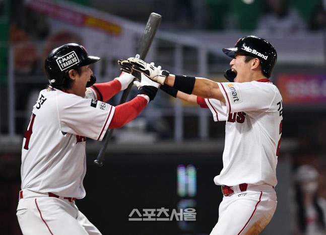 SSG 김민식(오른쪽)이 20일 인천 SSG랜더스필드에서 열린 2022 KBO리그 LG와의 경기 9회말 무사 1,2루 상황에서 최지훈의 중견수 뜬공 때 상대 실책을 틈타 2루에서 홈까지 달려 끝내기 득점을 한 뒤 최정과 함께 ㄱ뻐하고 있다. 2022. 5. 20.