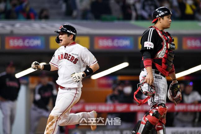 SSG 김민식(왼쪽)이 20일 인천 SSG랜더스필드에서 열린 2022 KBO리그 LG와의 경기 9회말 무사 1,2루 상황에서 최지훈의 중견수 뜬공 때 상대 실책을 틈타 2루에서 홈까지 달려 끝내기 득점을 하고 있다. LG 포수는 유강남. 2022. 5. 20.