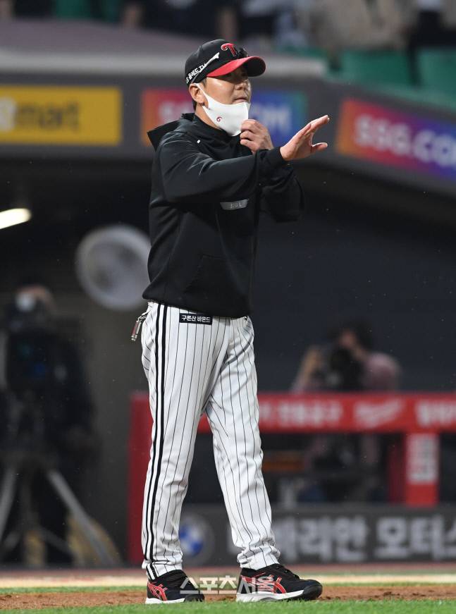 LG 류지현 감독이 20일 인천 SSG랜더스필드에서 열린 2022 KBO리그 SSG와의 경기 9회말 끝내기 실책 상황에 대해 심판진에게 비디오판독을 요청하면서 설명을 하고 있다. 2022. 5. 20.