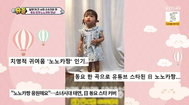이날 노노카는 사유리의 반주를 듣자마자 어떤 동요인지 알아챈 후 함께 노래를 부르는 등 '동요 천재'다운 모습을 보였다. (사진=KBS 2TV '슈퍼맨이 돌아왔다' 캡처)