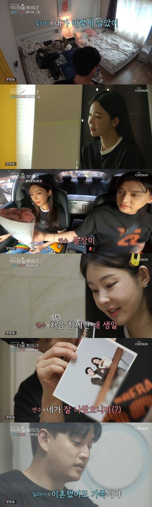 5년 전 웨딩사진까지 발견해 추억에 잠긴것도 잠시, 지연수는 "액자 민수꺼 빼고 다 버리자"라고 냉정하게 말했다. 하지만 일라이는 "보통 사진만 두고 액자만 버리라고 하지 않나. 앨범은 버리는거 아니다. 왜 버리냐. 미래를 모르는데. 나중에 민수가 엄마 결혼식 사진 찾으면 어떡하냐. 보고싶다고 하면 보여주는거다"라며 "아쨌든 우린 가족이니까 가족사진 갖고 있어야한다. 이혼했어도 가족이다"라고 말했다. 지연수는 "너 그러다 재혼하면 어떡하려고 그러냐"고 핀잔을 줬지만, 일라이는 "누구랑? 너랑? 재혼 안할거다. 이렇게 살거다"라고 돌직구를 날렸다.