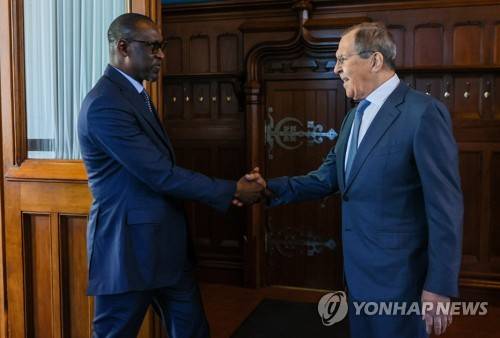 epa09960592 A handout photo made available by the press service of the Russian Foreign Affairs Ministry shows Russian Foreign Minister Sergei Lavrov (R) shaking hands with Malian Foreign Minister Abdoulaye Diop (L) during their meeting in Moscow, Russia, 20 May 2022. Malian Foreign Minister is on a working visit in Moscow. EPA/RUSSIAN FOREIGN AFFAIRS MINISTRY HANDOUT MANDATORY CREDIT HANDOUT EDITORIAL USE ONLY/NO SALES
