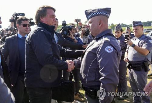 Brazilian President Jair Bolsonaro greets police as he arrives to a resort hotel where he is expected to meet with Elon Musk in Porto Feliz, Brazil, Friday, May 20, 2022. Musk, the Telsa and SpaceX chief executive officer, tweeted that he was in Brazil to help bring Internet service to rural schools in the Amazon and to help monitor the Amazon environmentally. (AP Photo/Andre Penner)