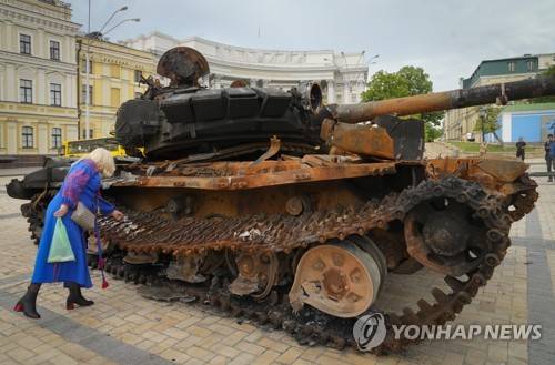 A woman looks at a destroyed Russian tank installed as a symbol of war in central Kyiv, Ukraine, Friday, May 20, 2022. (AP Photo/Efrem Lukatsky)