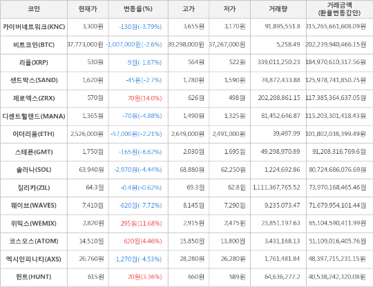한편 거래금액 기준으로는 카이버네트워크, 비트코인, 리플 순으로 가장 활발한 거래를 보이고 있다.