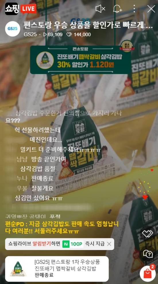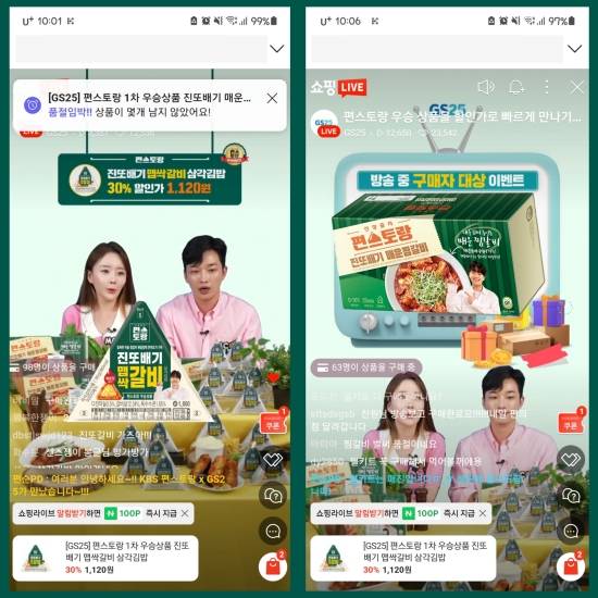 우승이 확정되자마자 네이버 쇼핑 라이브에서는 바로 '진또갈비' 밀키트와 삼각김밥의 라이브 커머스가 시작됐다.