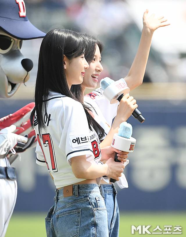 우주소녀 보나, 설아가 시구 시타에 앞서 인사를 하고 있다.