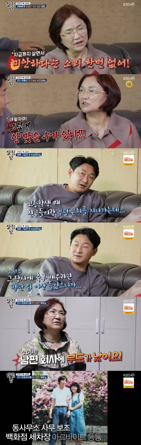 이천수 어머니는 "(남편) 회사가 부도가 났다. 얘는 운동한다고 하지 아빠는 저러고 있는데 어떻게 하냐. 86년도에 보험회사를 다니고 동사무소에서 사무 보조, 백화점 세차하는 거 했다. 그렇게 열심히 하는데 뒷바라지를 당연히 해야지. 힘들지도 않았다"라며 고백했다.
