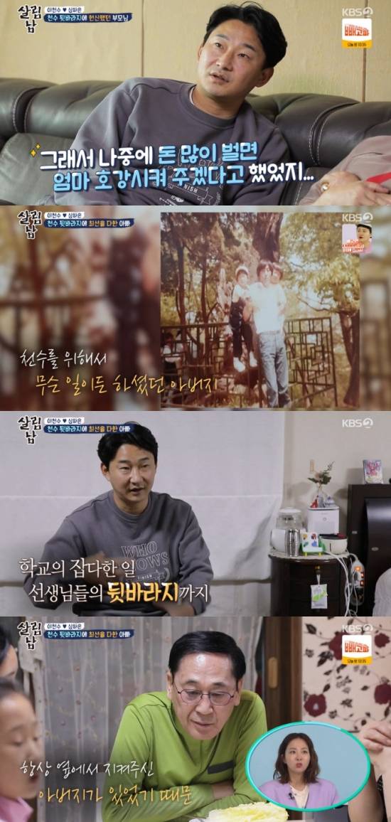 이천수는 "운동할 때 경제적인 부분이 되면 경제적으로 돕는 부모님들도 계시고 경제적인 부분이 안되면. (아버지가) 학교에서 거의 사셨다. 들어와서 숙소 잡일도 다 하셨고 선생님들 필요한 거 일일이 다 했다. 모든 일을 다 하셨던 것 같다. 운동만 보고 갔던 건 옆에 아빠가 계시니까"라며 고마움을 드러냈다.