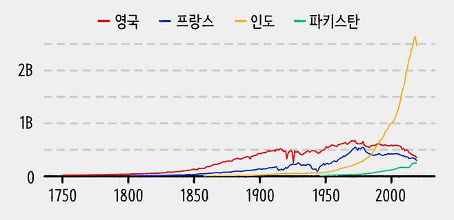 국가별 탄소배출량을 살펴보면 1800년대 말 산업혁명 시기부터 유럽 국가의 탄소배출량은 빠르게 증가했습니다. 그러나 1950년대를 넘어가면서 인도가 크게 치고 나와. 인도는 미국, 중국에 이어 2020년 전 세계 이산화탄소 배출량 3위를 차지하고 있죠. 선진국에게만 책임을 전가하기엔 너무 많은 탄소가 배출되고 있는 건 아닐까요? 파키스탄도 탄소배출량이 매년 증가하면서 유럽 국가의 배출량을 바짝 따라잡았습니다. 선진국의 역사적 책임을 부정할 수는 없지만 인도, 파키스탄과 같은 개발도상국의 배출량도 환경에 위협이 되고 있는 상황입니다.